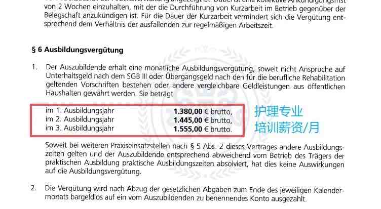 这个薪资水平在双元制护理培训中真的很有竞争力!根据德国公共部门护理培训标准TVAöD Pflege,2026年5月起培训津贴普遍在第一年1365-1491欧、第二年1425-1552欧、第三年1522-1653欧之间。许同学拿到的offer完全对标这个标准,属于行业上游水平!